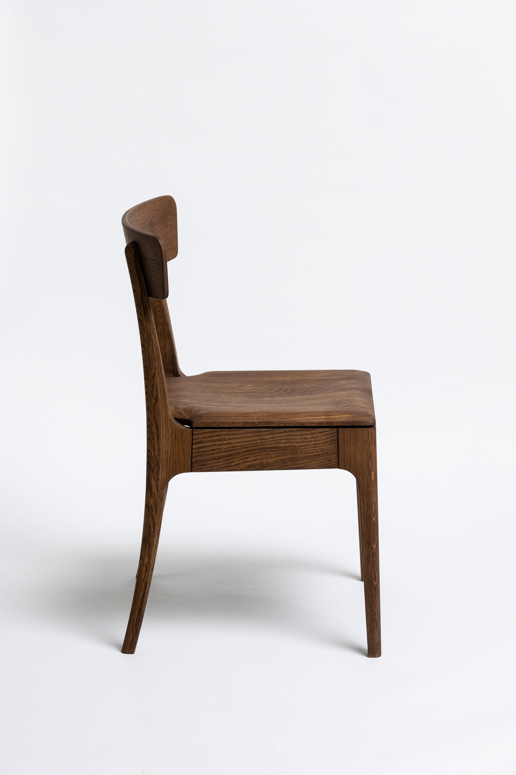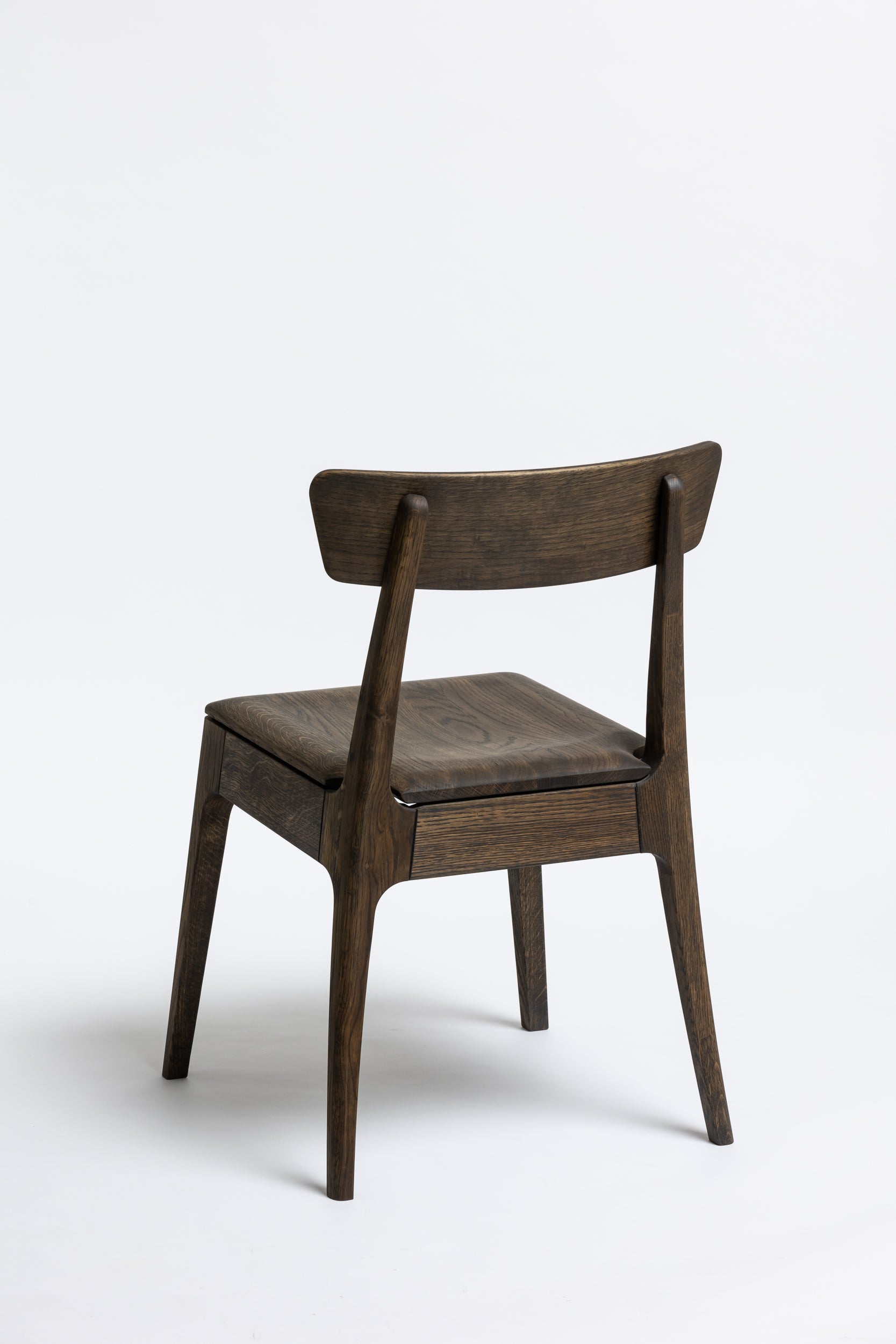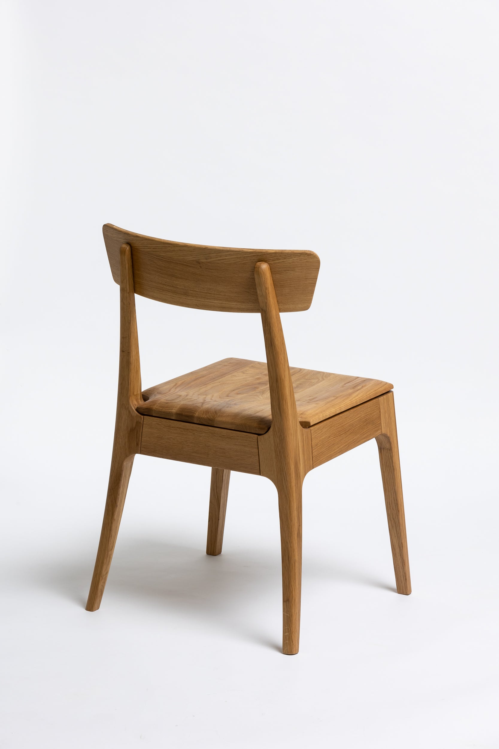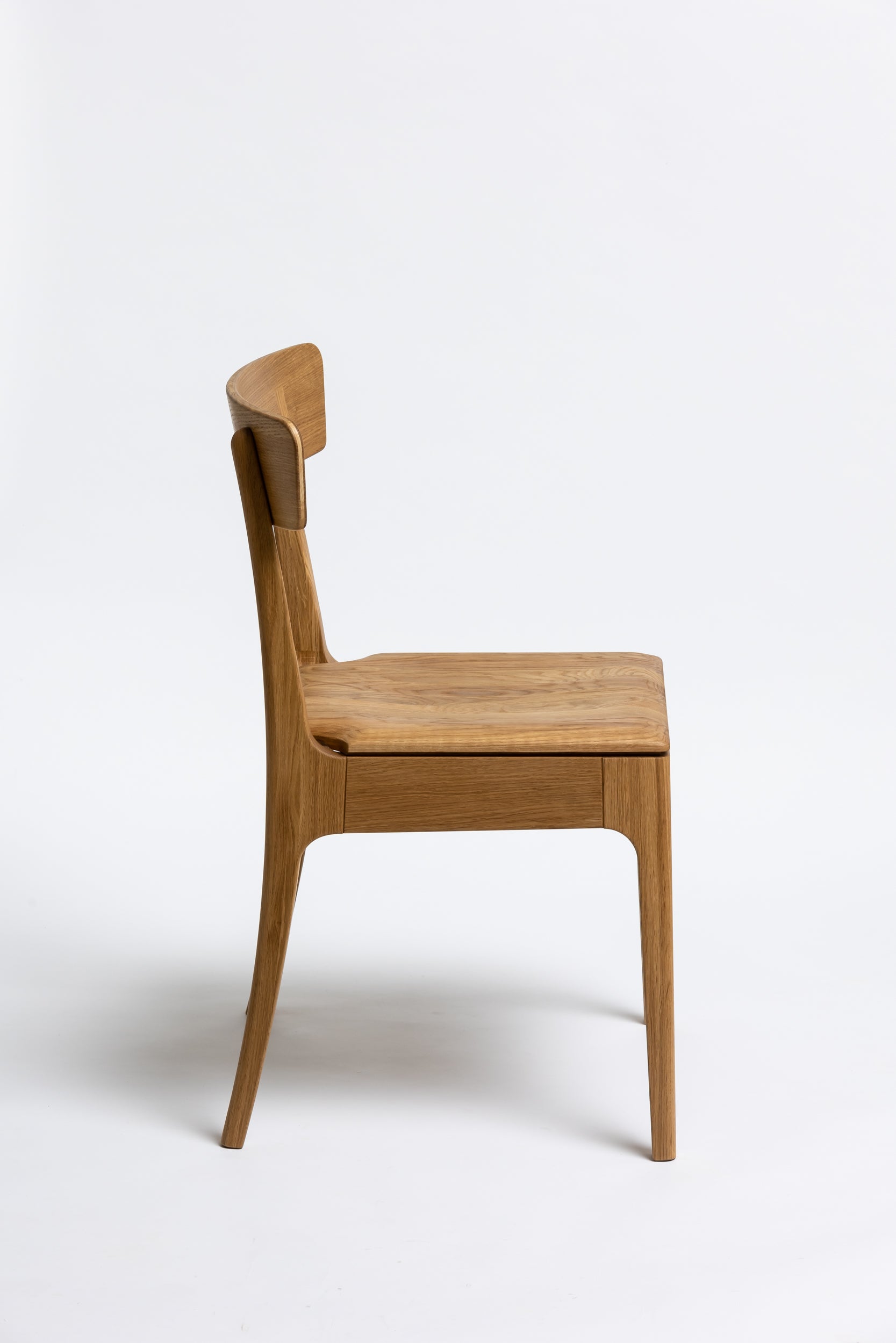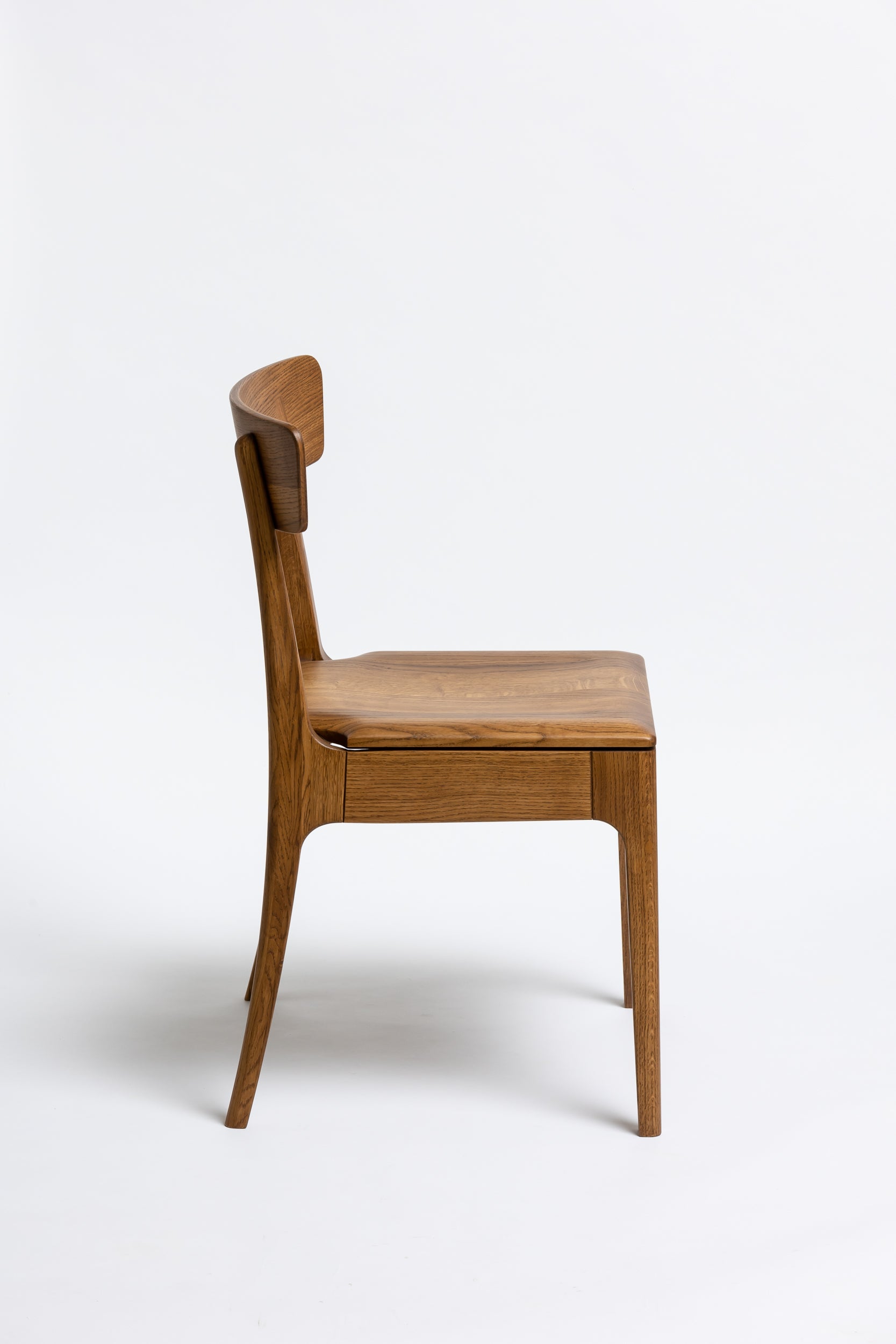 Die sanft geschwungene Rückenlehne bietet angenehmen Halt, während die geformte Sitzfläche aus Massivholz sich der Körperform anpasst. Schlanke, leicht zulaufende Beine verleihen dem Stuhl eine leichte, elegante Silhouette und machen ihn einfach mit modernen wie klassischen Einrichtungen kombinierbar. Die Oberfläche ist mit Rubio Monocoat 2C-Öl veredelt, das sie im Alltag zuverlässig schützt und trotzdem die natürliche Haptik des Holzes bewahrt.