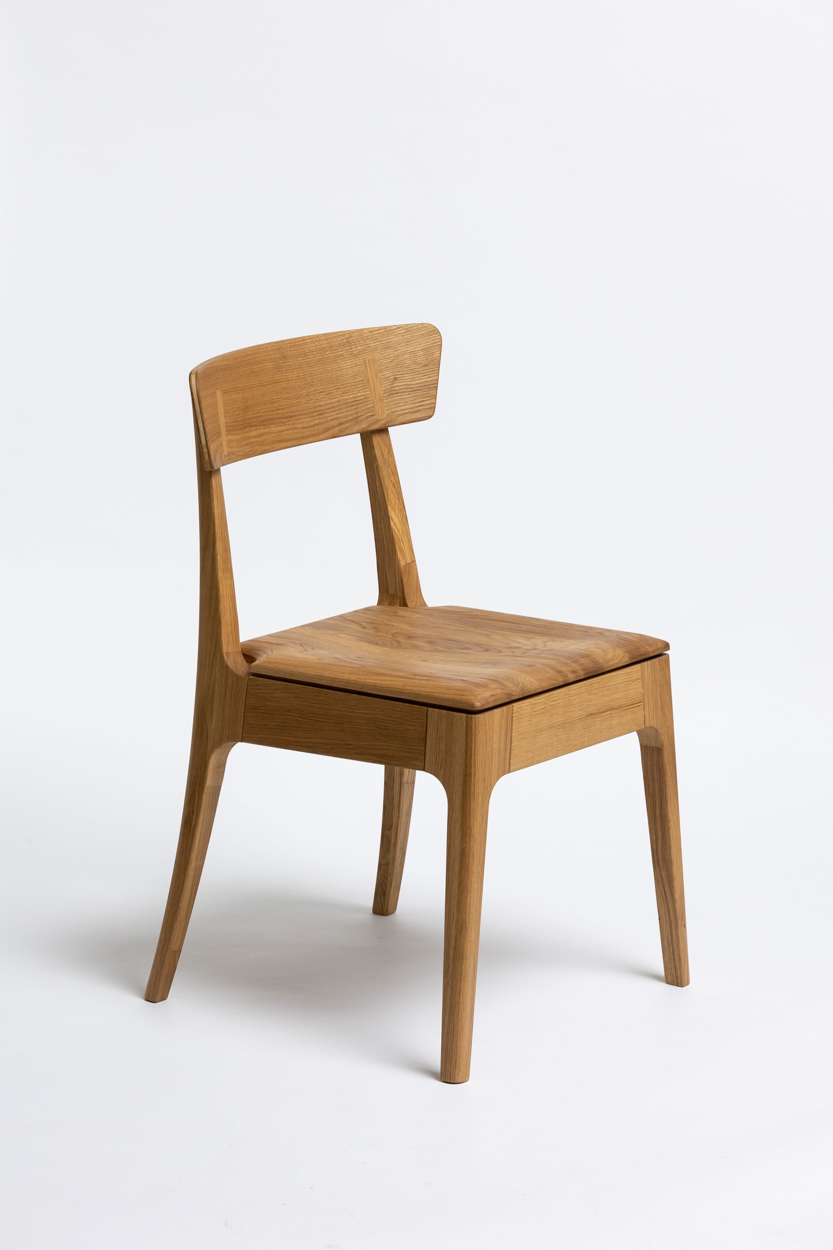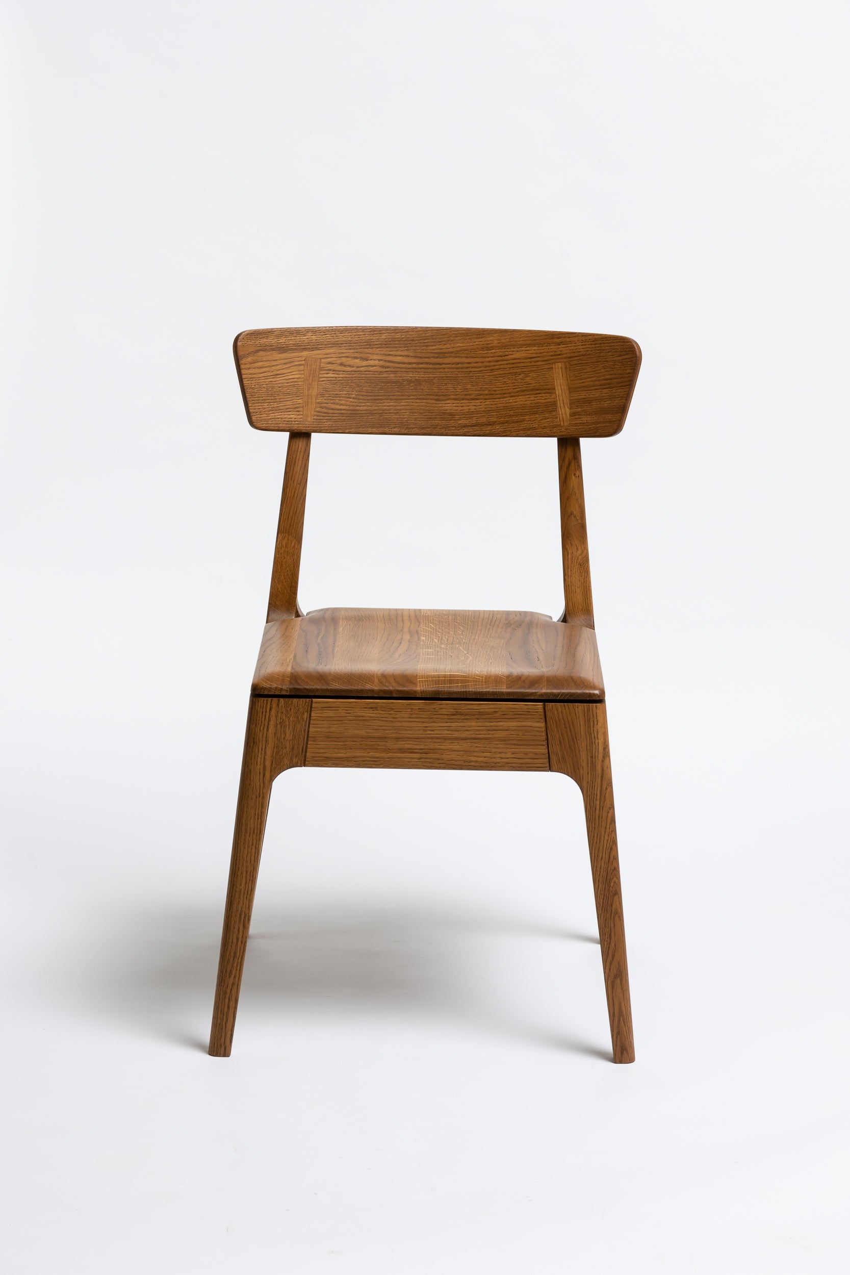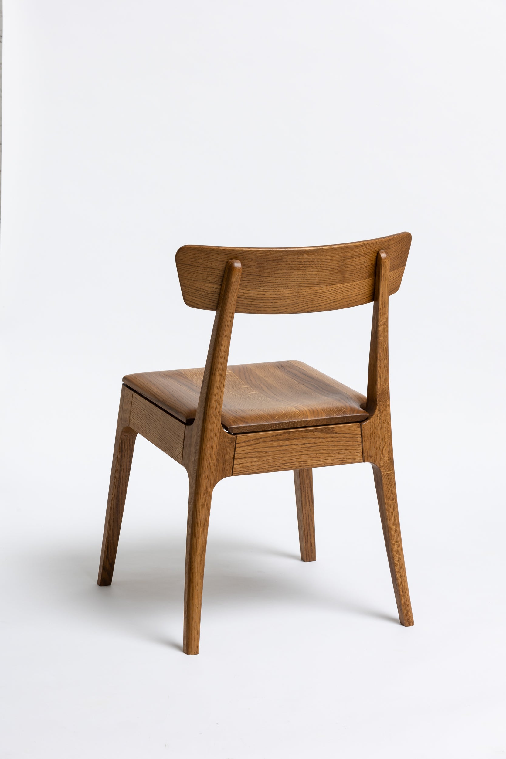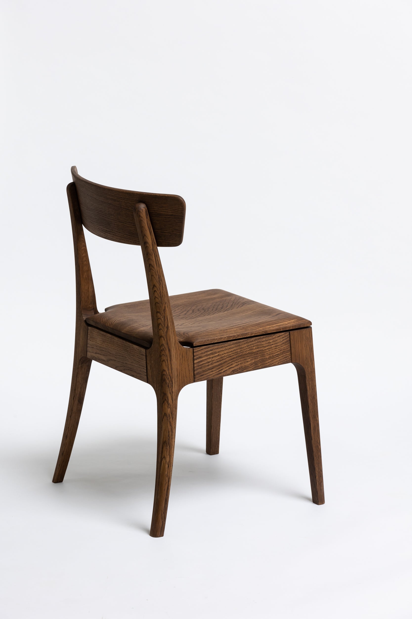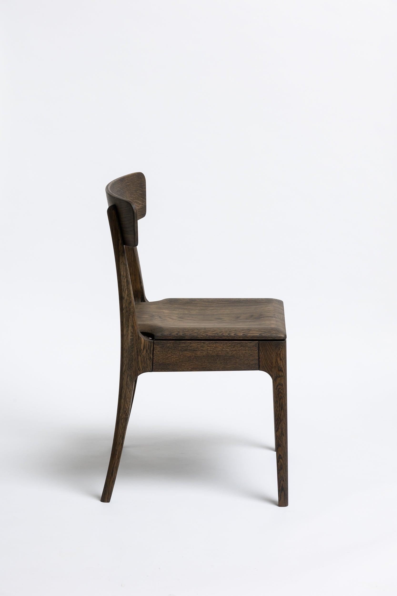 Die sanft geschwungene Rückenlehne bietet angenehmen Halt, während die geformte Sitzfläche aus Massivholz sich der Körperform anpasst. Schlanke, leicht zulaufende Beine verleihen dem Stuhl eine leichte, elegante Silhouette und machen ihn einfach mit modernen wie klassischen Einrichtungen kombinierbar. Die Oberfläche ist mit Rubio Monocoat 2C-Öl veredelt, das sie im Alltag zuverlässig schützt und trotzdem die natürliche Haptik des Holzes bewahrt.
