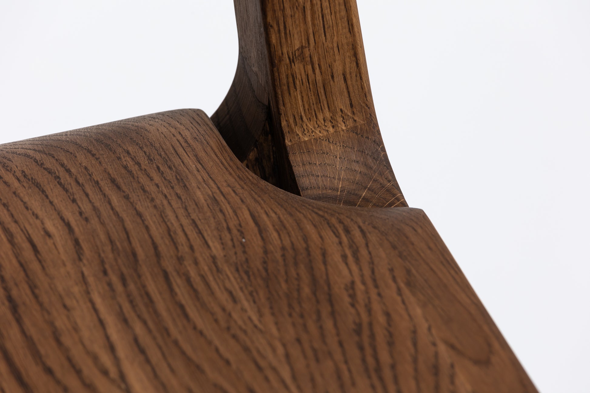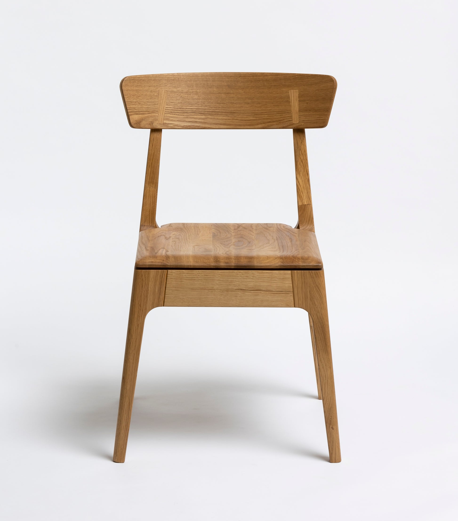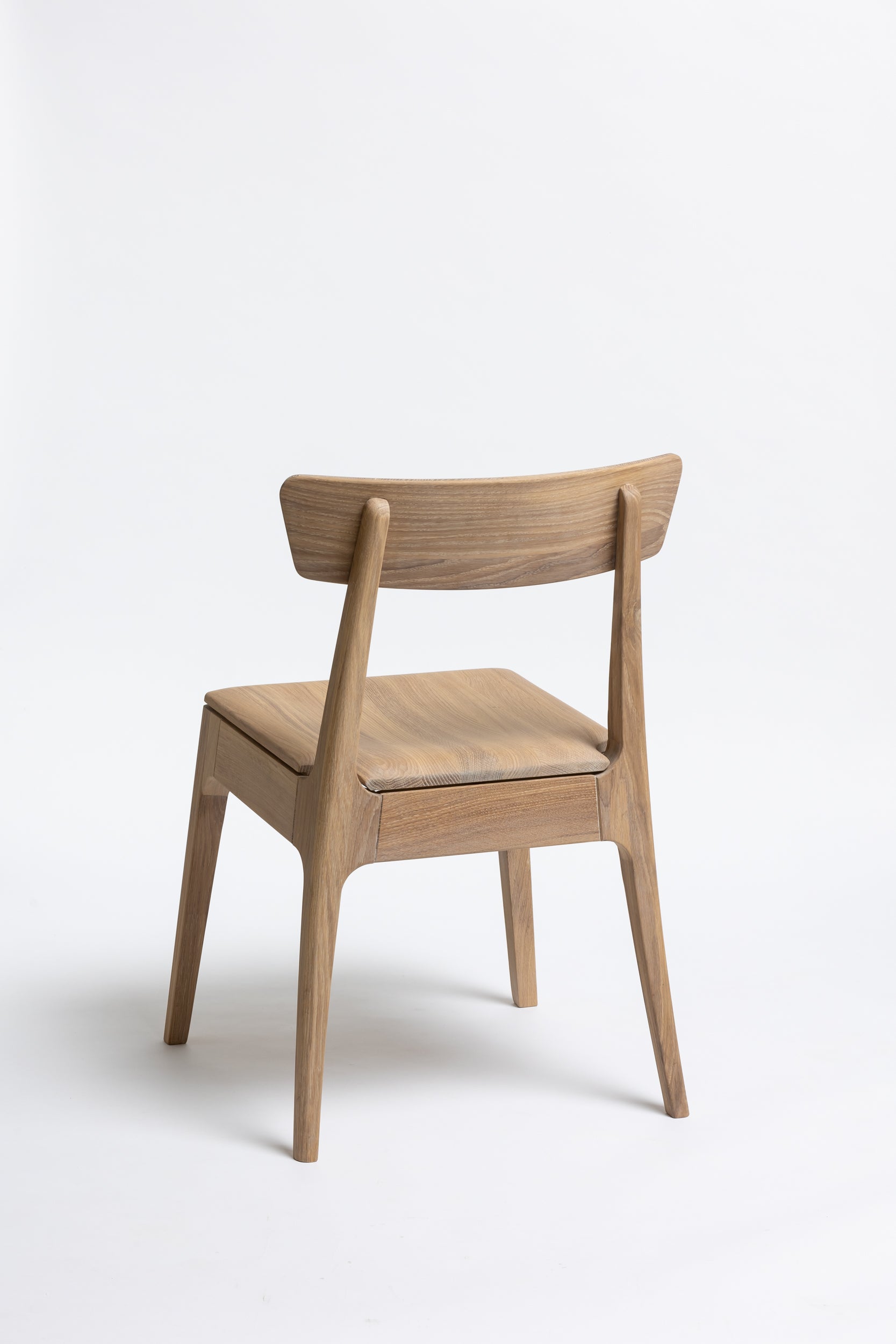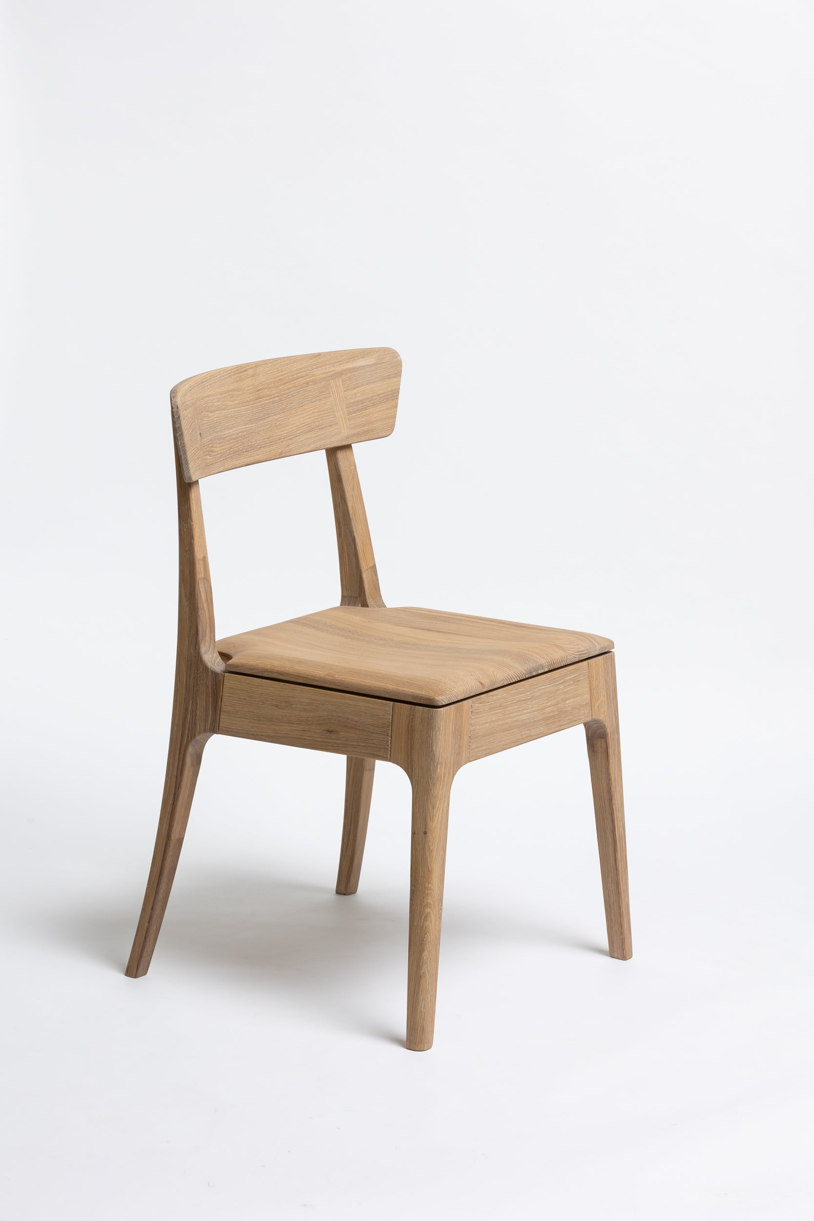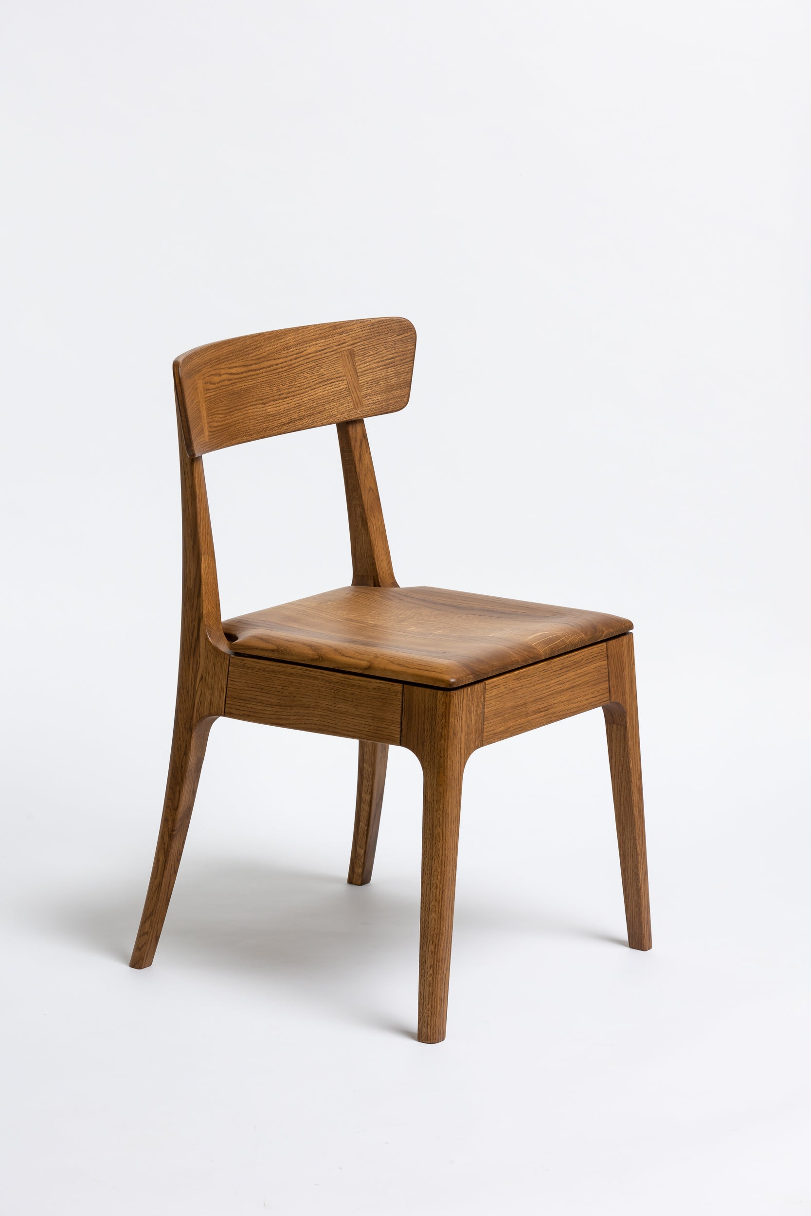 Die sanft geschwungene Rückenlehne bietet angenehmen Halt, während die geformte Sitzfläche aus Massivholz sich der Körperform anpasst. Schlanke, leicht zulaufende Beine verleihen dem Stuhl eine leichte, elegante Silhouette und machen ihn einfach mit modernen wie klassischen Einrichtungen kombinierbar. Die Oberfläche ist mit Rubio Monocoat 2C-Öl veredelt, das sie im Alltag zuverlässig schützt und trotzdem die natürliche Haptik des Holzes bewahrt.