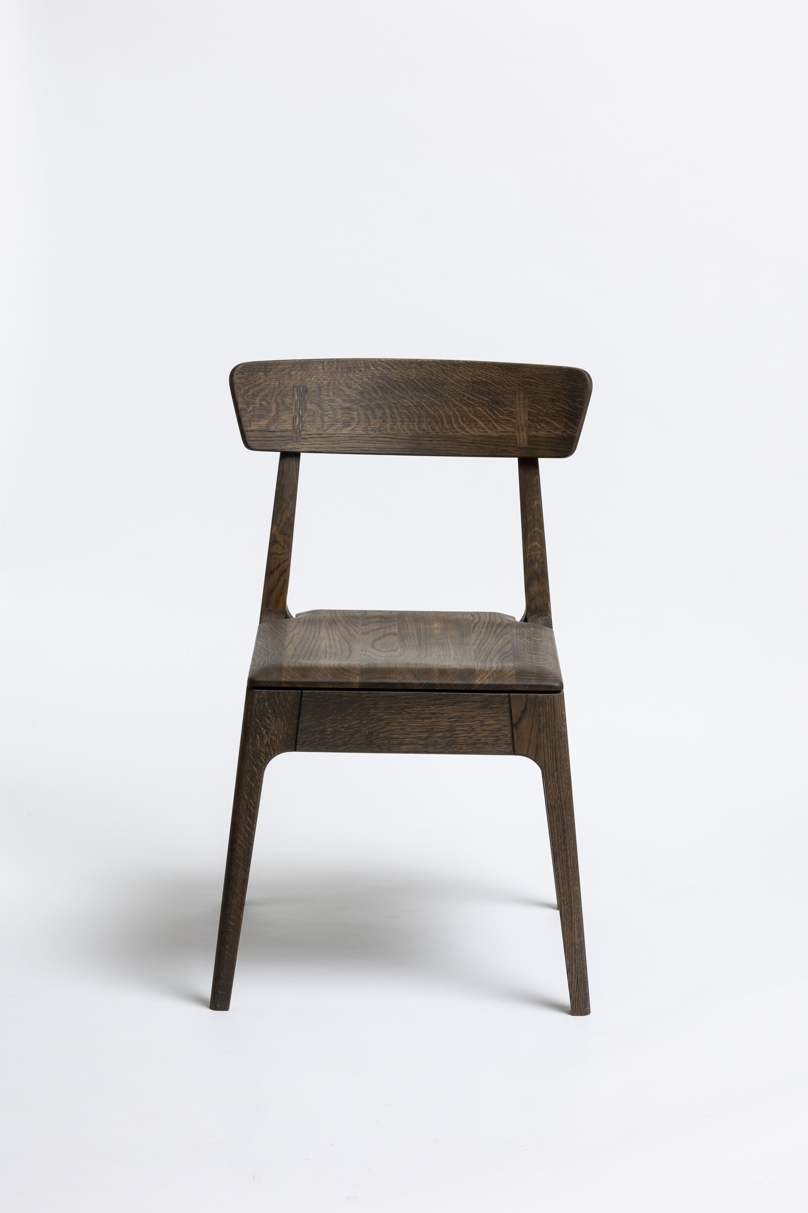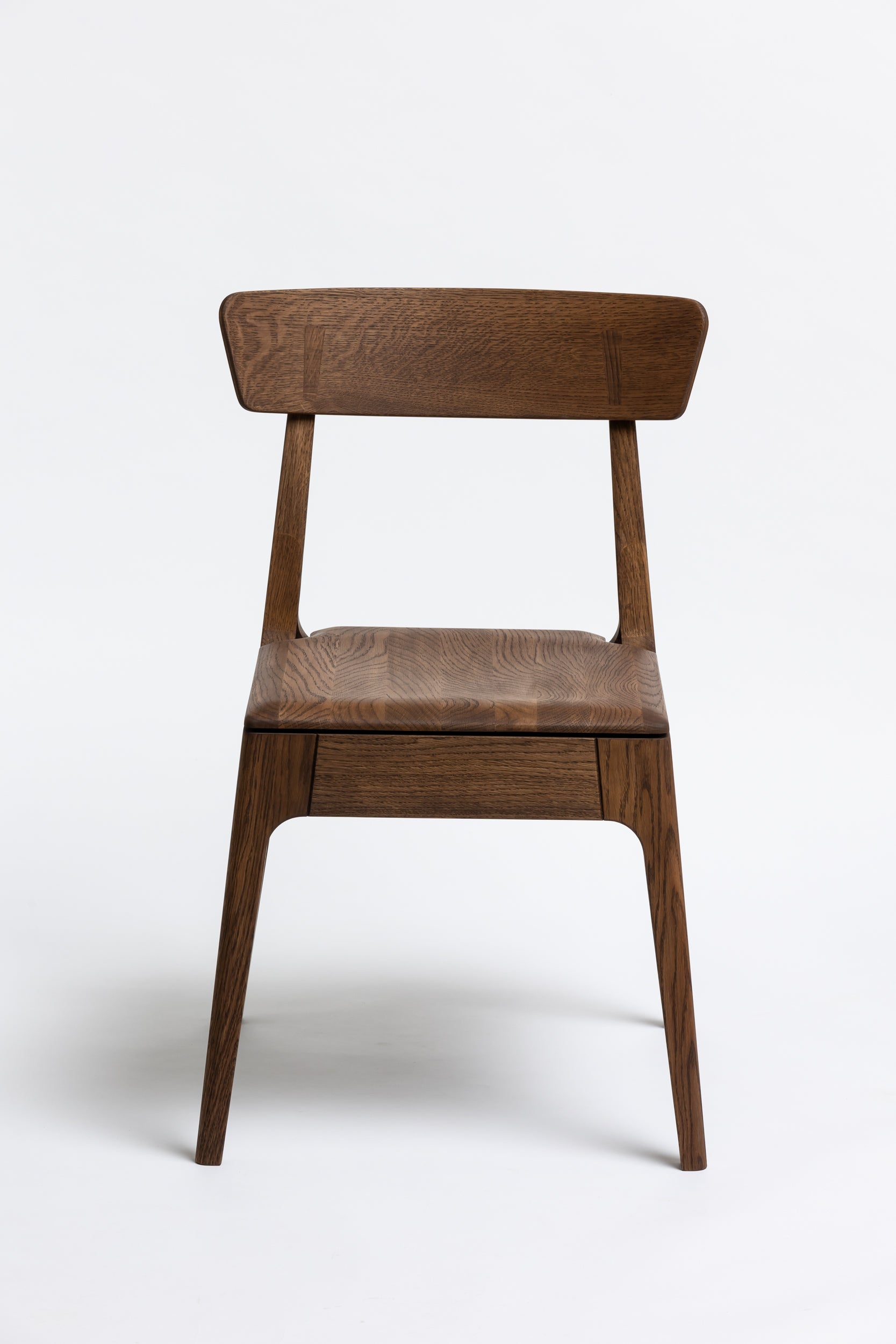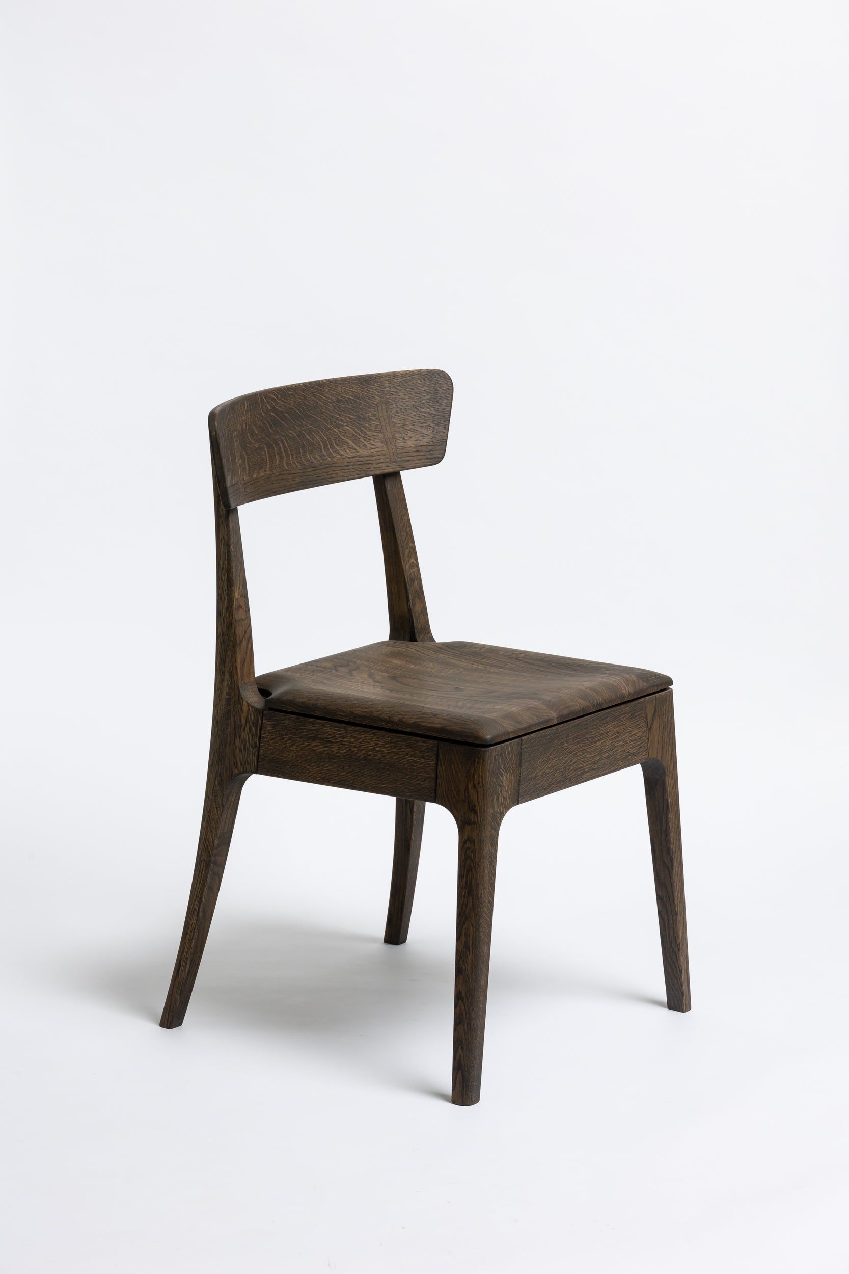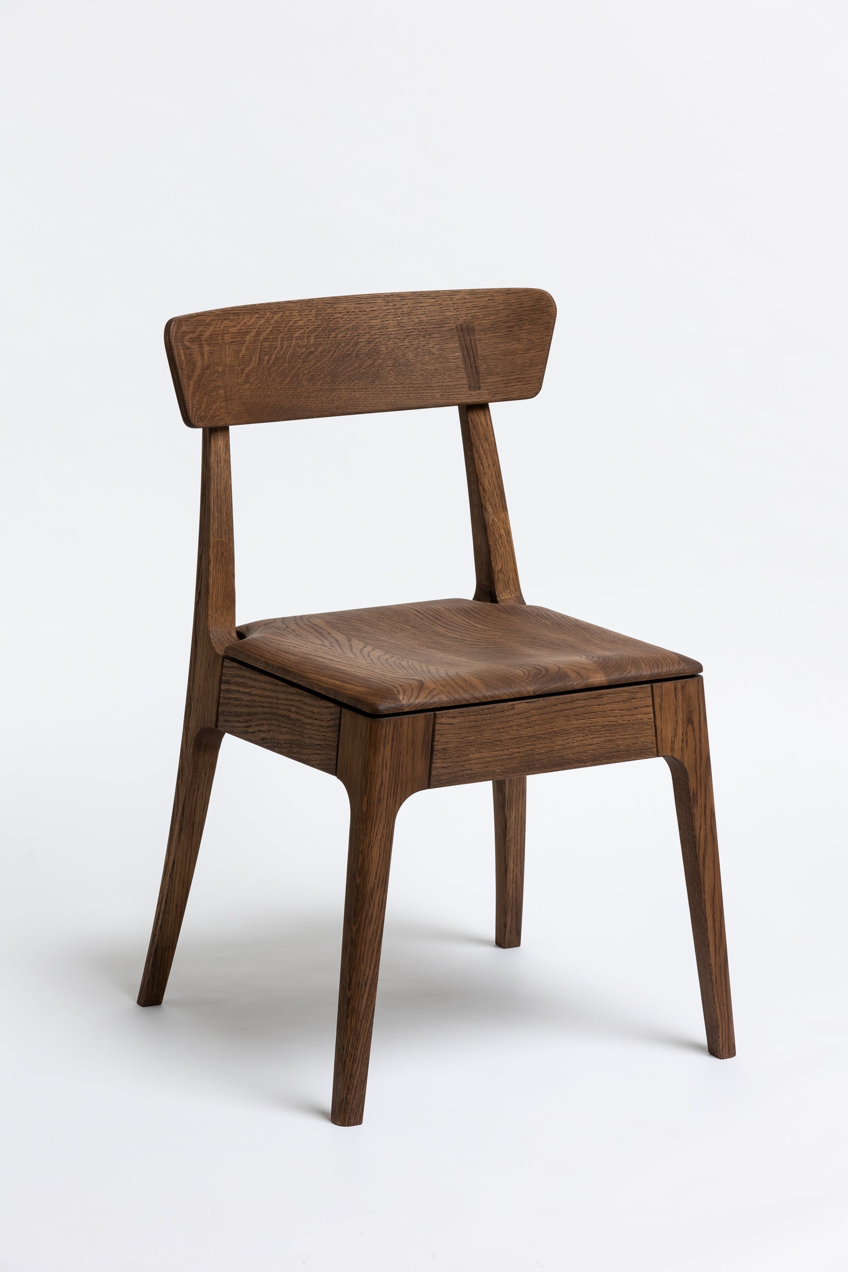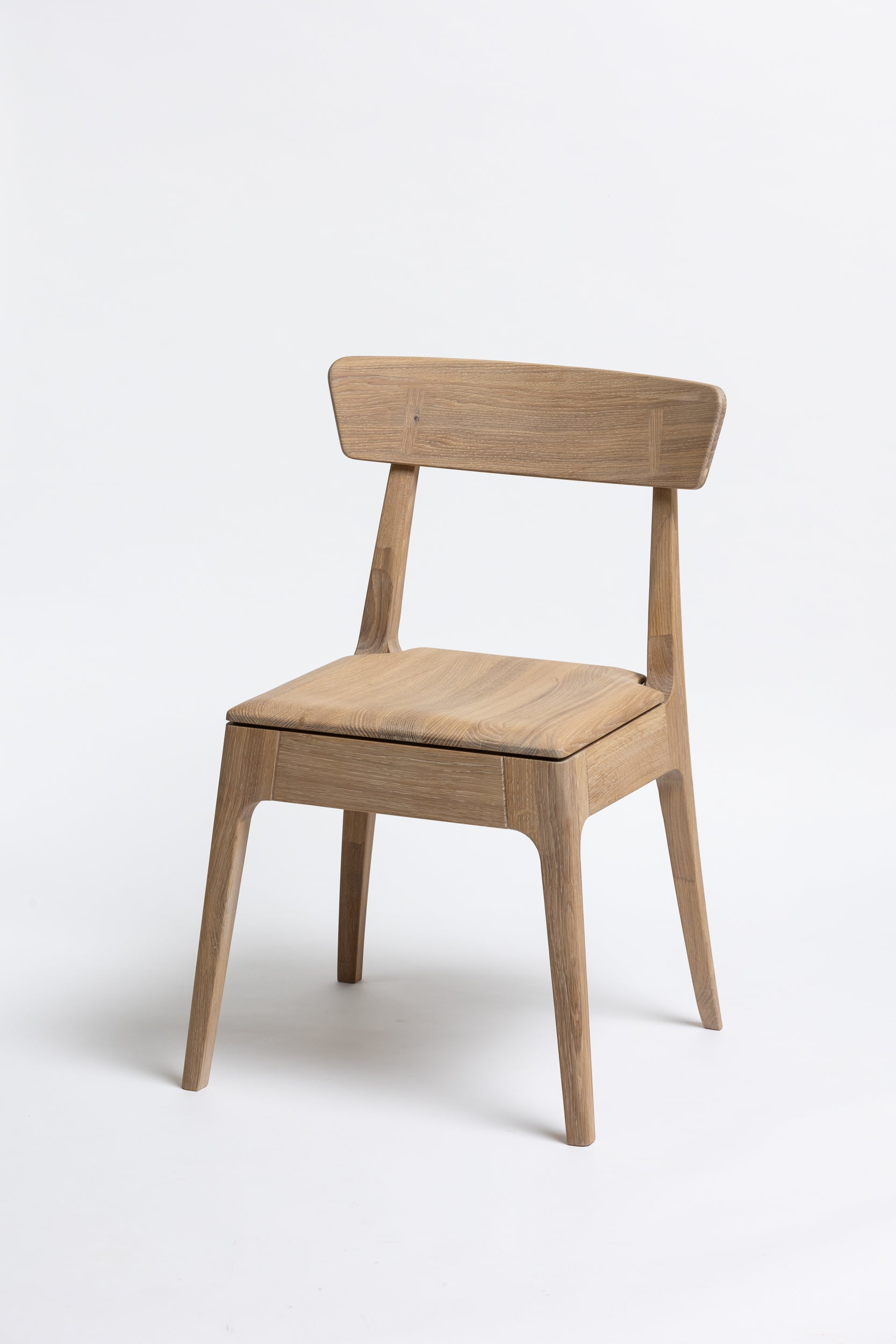 Die sanft geschwungene Rückenlehne bietet angenehmen Halt, während die geformte Sitzfläche aus Massivholz sich der Körperform anpasst. Schlanke, leicht zulaufende Beine verleihen dem Stuhl eine leichte, elegante Silhouette und machen ihn einfach mit modernen wie klassischen Einrichtungen kombinierbar. Die Oberfläche ist mit Rubio Monocoat 2C-Öl veredelt, das sie im Alltag zuverlässig schützt und trotzdem die natürliche Haptik des Holzes bewahrt.